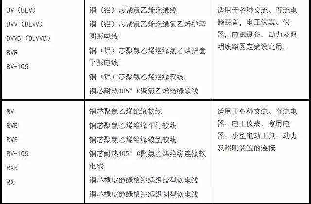 ②電線型號:BV單股,BVR多股,BVV雙膠單股,BVVR雙膠多股;